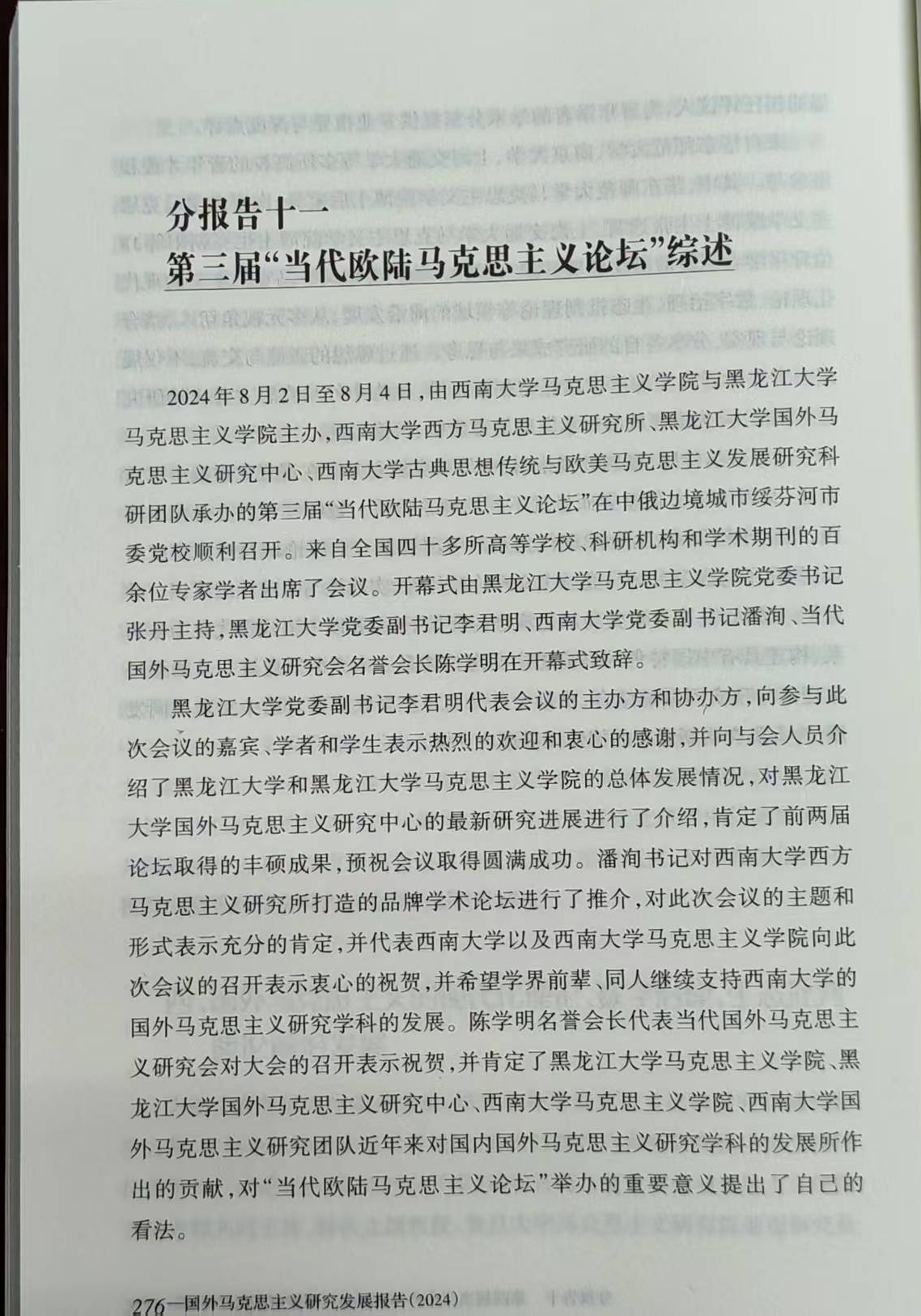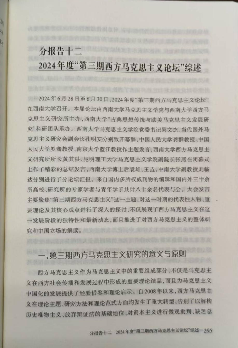 据悉,近日,西南大学西方马克思主义研究所的研究报告《第三届“当代欧陆马克思主义论坛”综述》以及《2024年度“第三期西方马克思主义论坛”综述》均已在《国外马克思主义研究发展报告(2024)》上发表,该书于2025年10月正式出版。这标志着西南大学国外马克思主义研究团队的研究内容连续七年都入选了《国外马克思主义研究发展报告》,反映了西南大学的国外马克思主义研究的质量和水平得到了国内学术界的认可。